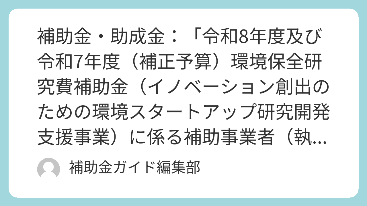 - 環境政策への貢献: 令和7年度補正予算と令和8年度予算を組み合わせて実施される、イノベーション創出に直結する環境スタートアップ支援の根幹を担うことができます。