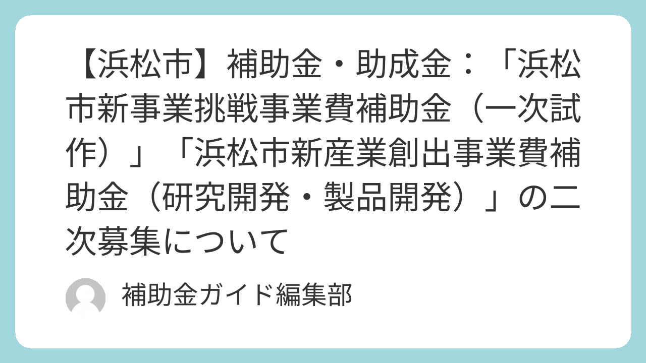 【浜松市】補助金・助成金:「浜松市新事業挑戦事業費補助金(一次試作)」「浜松市新産業創出事業費補助金(研究開発・製品開発)」の二次募集について